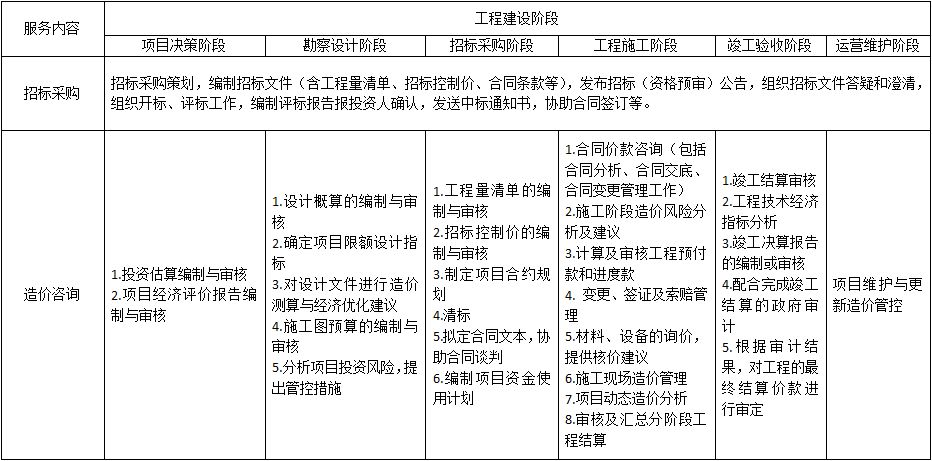 (3)招标采购阶段包括但不限于:招标策划、市场调查、招标文件(含工程量清单、投标限价)编审、合同条款策划、招投标过程管理等;