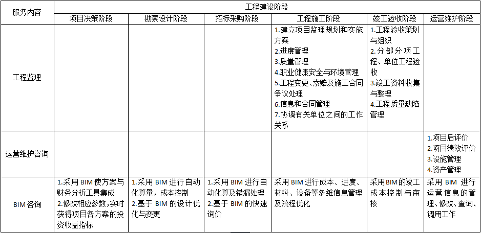 (4)工程施工阶段包括但不限于:工程质量、造价、进度控制,勘察及设计现场配合管理,安全生产管理,工程变更、索赔及合同争议处理,担心技术咨询,工程文件资料管理,安全文明施工与环境保护管理等;