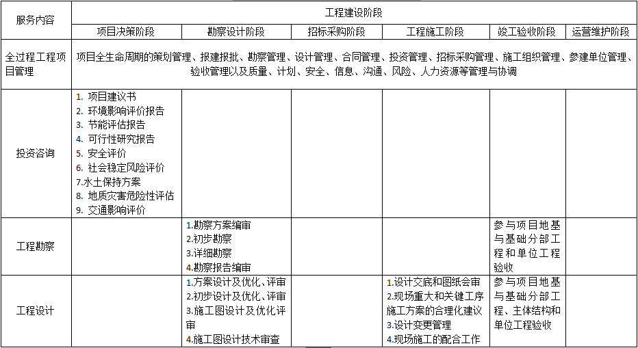 1 全过程工程项目管理:主要包括项目策划管理、报建报批、勘察管理、设计管理、合同管理、投资管理、招标采购管理、施工组织管理、参建单位管理、验收管理以及质量、计划、安全、信息、沟通、风险、人力资源等管理与协调工作。