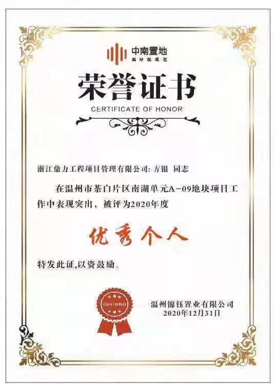 中南地产项目部方银同志荣获“优秀个人”荣誉;