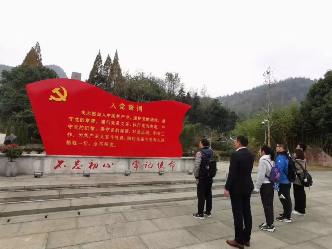 全体参观人员在红十三军革命纪念碑前驻足瞻仰、默哀。并在入党誓词前举起右手,紧握拳头,重温入党誓词:“我志愿加入中国共产党,拥护党的纲领,遵守党的章程,履行党员义务……”掷地有声的每个字饱含着共产党人的光荣使命。