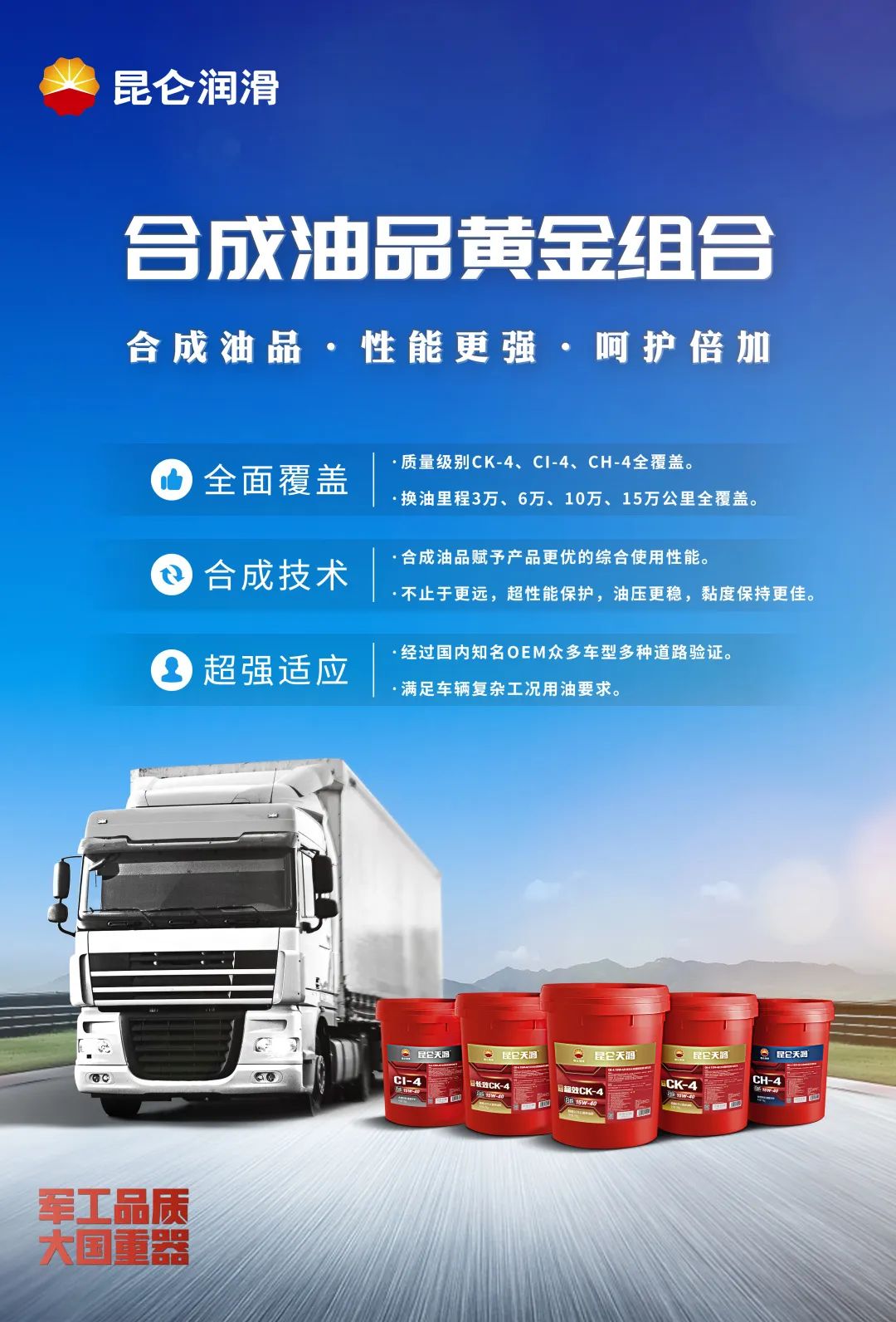 昆仑天鸿系列产品采用合成技术研发而成,综合性能更加优良。质量级别从CH-4、CI-4、CK-4全覆盖,换油里程从2万到15万公里全覆盖。赋予油品优异的高温保护性能,保证油膜强度,油压更稳,黏度保持更佳。同时优异的低温性能提升了低温冷启动效率,降低冷启动时的磨损,减少燃油消耗,保证长期跨温区、跨地域使用。合成油组合产品经过国内知名OEM众多车型多种道路环境验证,满足各种复杂工况的用油要求。